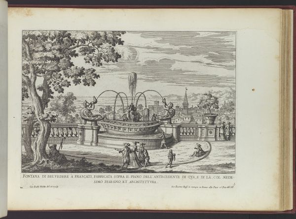 Editor: This is "Gezicht op een deel van het waterspel te Karlsberg," or "View of a part of the water feature at Karlsberg," an etching and engraving from 1706 by Giovanni Girolamo Frezza. It's such an elaborate design, almost dreamlike in its scale. How do you interpret the symbols or the overall feeling of the artwork? Curator: This work pulls on long traditions of representing power and control through landscape. Note how the architecture is interwoven with nature, a signature element of the Baroque garden. Water, specifically, has always held significant symbolic weight: cleansing, life-giving, but also powerful and uncontrollable. Here, the artist renders it geometric and utterly managed. Editor: Managed… I see what you mean. So, the controlled water features almost declare dominance over nature itself? Curator: Precisely. Consider the cultural memory associated with fountains - think of the Roman aqueducts, symbols of empire. These elaborate water features also reflect the patron's ability to command resources, labor, and engineering prowess, announcing to the world "Look what I have achieved!" Do you see the figures as more important as the building? Editor: That makes a lot of sense! The human figures seem dwarfed by the setting. It is all starting to fit into place: order, control, and display of power all at play! Curator: Absolutely! And think about how the print medium itself further disseminated this message of power, replicating and spreading the image far beyond the garden walls. An ingenious combination of imagery! Editor: I hadn't thought about that! I'll never look at Baroque gardens the same way again. Thanks so much!
