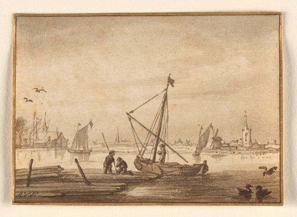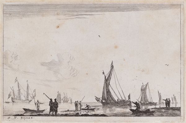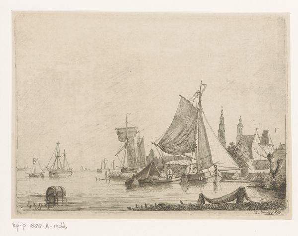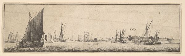 Curator: Before us, we have Poul Isac Grønvold’s engraving, "Frederik V st\u00e5r ud fra Kors\u00f8r," dating from 1749. Editor: Ooh, drama! It feels very staged, almost theatrical, with that dramatic puff of smoke and those ships positioned just so. Curator: Indeed, there's a strong Baroque sensibility present. The meticulous detail, the interplay of light and shadow – even within a print – guides the eye strategically across the composition. Notice the precise delineation of the cityscape in the background versus the dominance of the ship in the foreground. The lines articulate form, defining shapes with incredible exactitude, an attempt to capture and distill a moment into clear, intelligible structures. Editor: It's interesting how the supposed subject, Frederik V, isn't explicitly depicted, or is he hidden somewhere? The ships command all the attention, these almost performative vessels cutting through a fairly still expanse of water. It really pulls at that tension of departure and anticipation. Are we watching a farewell? An inspection of his navy? This is why it looks like he is heading off for Corsair! There's something faintly melancholic in the composition. Curator: The city, identifiable perhaps, could represent the Kingdom. What’s highlighted is the very spectacle and power, what it means to command it on the waters that support it, using both realistic representation and allegorical weight to construct and uphold ideas about rule, authority, and a controlled world. The materiality, too—that line scratched into copper and pressed onto paper—offers a fascinating parallel with what one expects art to produce through technical excellence. Editor: You put that into my head! So, what looks melancholy is just controlled, technical art practice, and by implication it is the exercise of authority in controlling, staging a vision...I guess it takes me back, full circle, I find in this exercise an uneasy power!