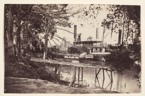 Editor: Here we have "Gezicht op de washuizen van Vannes," a photograph taken in 1901. I’m struck by the geometry here – the strong horizontal lines of the washing houses contrasting with the reflections in the water. What catches your eye in terms of composition? Curator: The tension between the constructed and the natural. Observe the precise rectangularity of the buildings offset by the organic forms of the trees and water. Notice how the tonal range is constricted, emphasizing form over hue. How does the photograph's texture influence your interpretation? Editor: I hadn't considered texture so specifically. It seems to give the photograph an older, almost ethereal, quality, softening the hard lines of the architecture. What do you make of the placement of the washing houses so prominently in the foreground? Curator: Placement directs the eye to its subject, but also reveals structure and perspective; it isn't arbitrary. Notice that light itself becomes almost palpable here, an entity with sculptural mass, especially across the building facades. Does that affect the balance? Editor: Absolutely. The light gives shape and substance to what could be a simple depiction. This focus on shape emphasizes structure. Curator: Precisely. We begin with our analysis. Reflect on your reaction, but remember also that this image uses tone, form, light and the geometry to create meaning beyond the simple description. We can learn about a structure in relation to light by noticing form in this case. Editor: This deeper dive into form helps uncover other meanings beyond the documentarian depiction of washerwomen's buildings. I’ll be looking at photographs with composition first from now on!