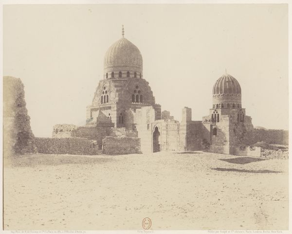 This albumen print shows the Dome of the Rock in Jerusalem, captured by Maison Bonfils. The sepia tones imbue the scene with a sense of antiquity, emphasizing the architectural forms and textures. The photograph’s structure is defined by geometric precision. The large dome anchors the composition, its spherical form contrasting with the linear details of the arcade below. The smaller domed structure and fountain to the left provide balance, while the vast open space in the foreground invites the viewer's eye to travel through the scene. The play of light and shadow accentuates the depth and volume of the architecture, highlighting the details of the stone and intricate designs. The formal qualities of this image serve to monumentalize the Dome of the Rock. The symmetry and careful arrangement of elements may speak to a desire to represent the site as a symbol of order and permanence. The photograph can be understood as a constructed representation, imbued with cultural and historical meaning. It invites us to consider the power of images in shaping our perception of places and histories.