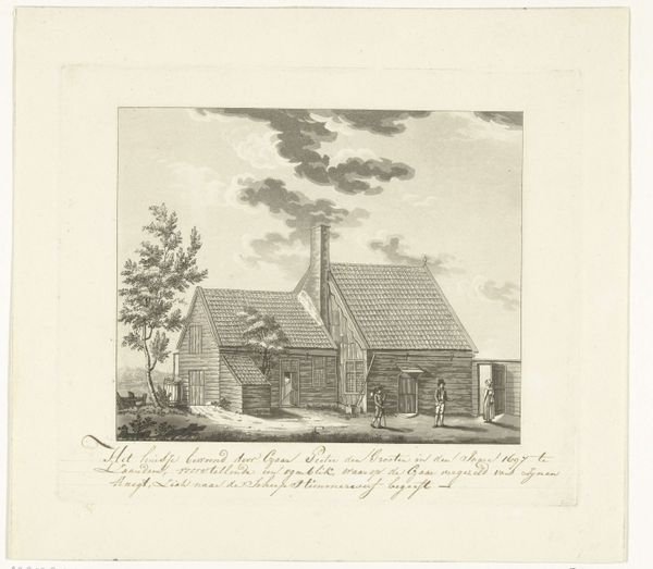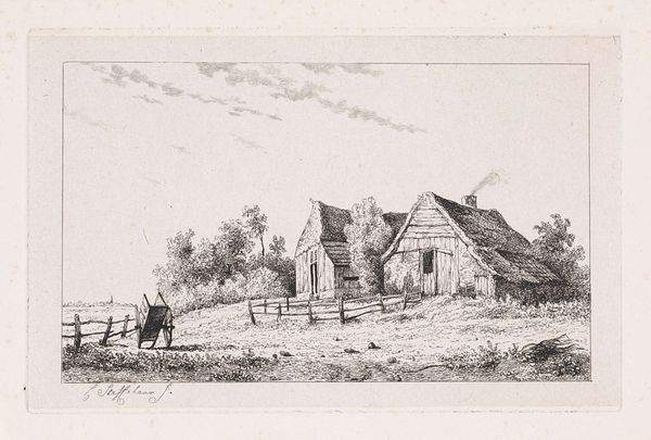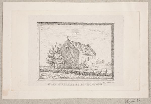 Curator: Here we have Julius Magnus-Petersen’s etching, "Salling Kirke," created between 1834 and 1866. Editor: My first impression is one of stark simplicity. The stark rendering captures a very still and almost austere scene. Curator: Absolutely, the print’s quiet mood draws us into a rural Danish landscape where the church dominates not just the immediate setting, but the community’s socio-religious life as well. The church’s stoic architecture echoes societal norms of that era, subtly reinforcing gendered power structures inherent in religious institutions. Editor: Yes, the labor evident in the tight, repetitive etched lines creating the stone textures emphasizes both the enduring nature of the physical building and the immense effort required to construct it. Consider the availability, transport and quarrying of the materials. The etching replicates the social impact and material burden on the local inhabitants who would've erected it. Curator: That materiality contrasts sharply with the implied spiritual dimension. I wonder too, how the placement of the stones along the bottom and sides of the print frames our reading of this building and of religious and social organization. Do we see evidence of patriarchy written within the social order? The building's solidity definitely gives it a permanent presence in its geographical, political, and social world. Editor: Definitely. Also, that texture creates a stark visual hierarchy; stone signifies permanence and investment of man-hours versus the less distinct sky. The choice of the etching process too…a replicable print…suggests a need for broader dissemination of a certain vision. A controlled replication is created to establish architectural or cultural visibility for church infrastructure. Curator: Considering that, the scale feels deliberate—grand but accessible—inviting introspection on faith’s role during the 19th century while it also hints at subtle patriarchal structures influencing everyday life through the building’s central function. Editor: I see your point and it helps cement my ideas regarding process and intention when deciding to replicate, disseminate and communicate through materials. Curator: And I find myself reassessing how art like this portrays and perpetuates normative, possibly inequitable power dynamics from bygone days. Editor: Looking closely allows us to appreciate the intersection between the building process and how its cultural weight is carried over the centuries.