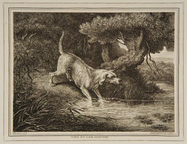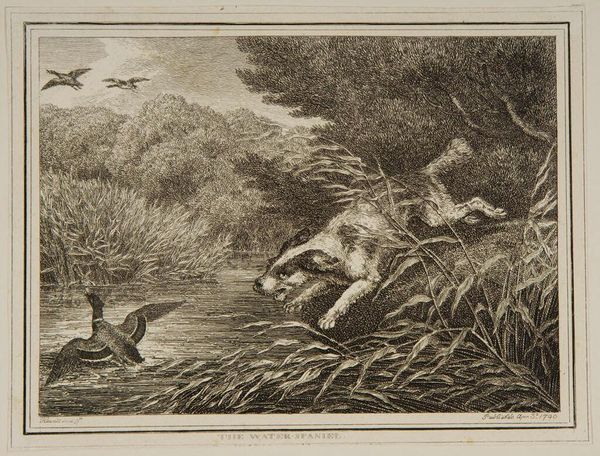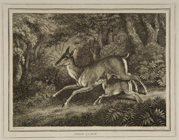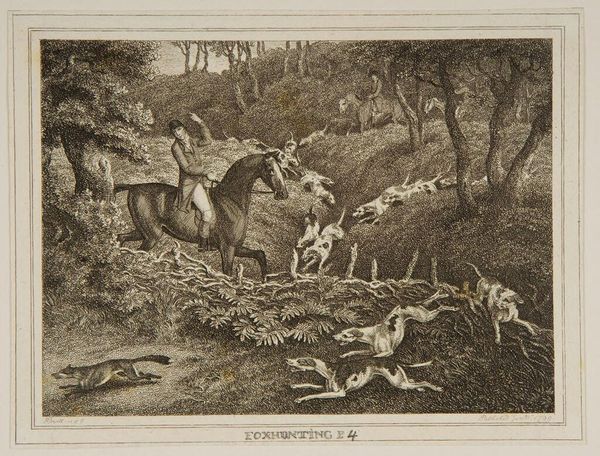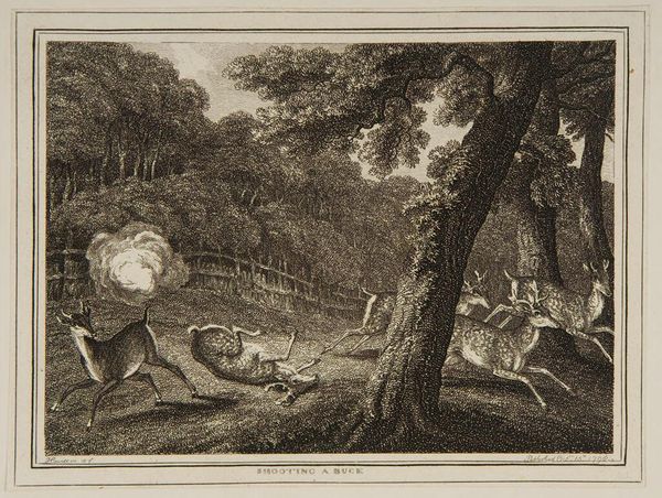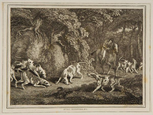 Curator: This is "Toiling a Buck" by Samuel Howitt, an intriguing image depicting a hunting scene. It certainly captures a moment of intense action! Editor: Indeed. The chaotic energy is palpable. The buck, the dog, the human figure... it's all a struggle for dominance within a specific social context. Curator: Precisely. Howitt's work often depicted the British countryside, reflecting the landed gentry's pursuits and values. This print reveals the power dynamics inherent in hunting. Editor: And the implied violence, the inherent objectification of the animal. It's not just about sport. It’s about reinforcing a social hierarchy and human supremacy, wouldn’t you agree? Curator: Absolutely. The imagery underscores how humans manipulate nature for their own purposes. Editor: It really makes you think about our relationship with the natural world. Curator: A powerful glimpse into a specific historical moment. Editor: One that still resonates today, sadly.