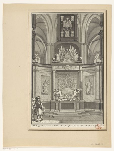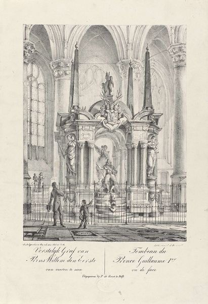 Jean Augustin Daiwaille made this lithograph of the tomb of Elisabeth Morgan van Marnix. It's an image that allows us to reflect on the social history of death, memory, and the institutional role of the church in 19th-century Europe. The image creates meaning through visual codes of mourning and remembrance – notice the elaborate tomb structure with its classical columns, heraldic symbols, and recumbent effigy. This speaks to the social status of the deceased and her family. The church in the background provides context, suggesting the importance of religious institutions in commemorating the dead and reinforcing social hierarchies. The presence of the figures in the foreground draws our attention to the act of viewing and remembering. To understand this artwork better, we might research the Morgan and Marnix families, the history of funerary monuments, and the role of the church in 19th-century society. This lithograph is a reminder that art is always embedded in a specific social and institutional context.