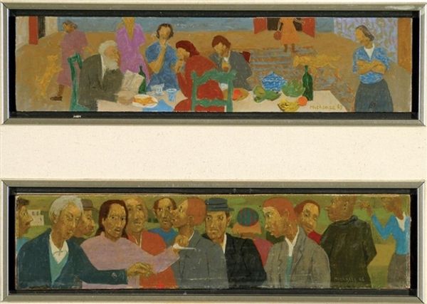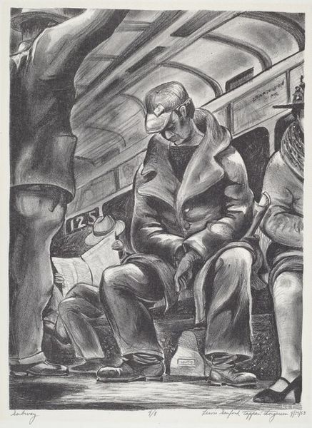 Editor: William Roberts' "Study for ‘Moving Day’" shows figures loading furniture onto a truck. The tight composition makes me feel a bit claustrophobic. What do you see in this piece that I might be missing? Curator: This image encapsulates a significant cultural shift. Consider the interwar period in Britain, with increased urbanization and social mobility. Moving became more common, signifying change. Roberts, influenced by Vorticism, simplifies the human form, almost mechanizing it. Editor: So the figures represent the broader social changes? Curator: Precisely. The act of moving, facilitated by technology, becomes a defining characteristic of modern life. Are they being liberated, or reduced to cogs in a machine? Editor: I hadn't considered the social commentary woven into what I saw as just a busy scene. Curator: Roberts' art is a mirror reflecting societal shifts, prompting us to question the human cost of progress.