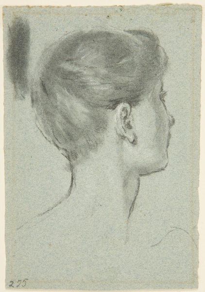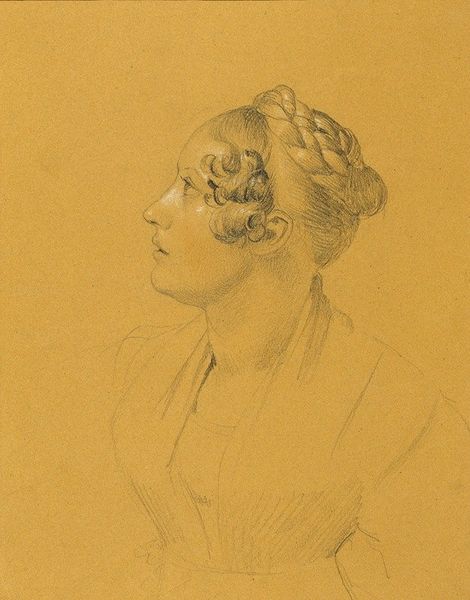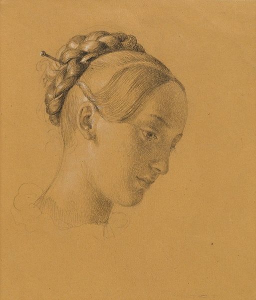 Johann Peter Krafft created this study of a female figure for wall paintings in the Hofburg using pencil on paper. The initial impression is the contrast between the soft gray lines of the figure against the warm, solid backdrop. Krafft masterfully employs the graphic qualities of the pencil to capture the texture and form of the subject. The delicate, curved lines describe the contours of her face and neck, while denser, layered strokes define the intricate arrangement of her hair. The subject's hairstyle and serene profile evoke classical sculpture, reflecting Neoclassical artistic principles of order, reason and symmetry, prevalent during the early 19th century. The lack of color directs our attention to the play of light and shadow, modeled through the careful application of graphite. This piece operates within a historical and cultural context where art served to idealize beauty. Ultimately, the drawing serves as a study, yet its formal qualities elevate it to a work of art.