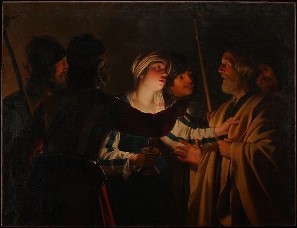 Curator: It’s quite somber, isn't it? That heavy darkness just dominates. Editor: Indeed. What we're looking at is "The Denial of Saint Peter," rendered around 1610 by the Baroque master, Caravaggio. The scene depicts the biblical moment when Peter denies knowing Christ. Curator: The symbolic weight here is immense, particularly considering the cultural context of Peter's role. The soldier's armor, that glint of light... they serve as potent reminders of the earthly powers at play during the Passion. Don't you think they act almost like instruments of fate here? Editor: Absolutely. And if we consider the gendered power dynamics of the scene, it’s quite revealing. Notice how the woman's gaze pierces Peter, holding him accountable while his posture speaks to shame. Caravaggio masterfully frames the social pressure—Peter isn't just denying Christ, but performing a very gendered dance of self-preservation. The performativity is key, isn’t it? Curator: It's compelling. His guilt seems to emanate from the core of his being. That single, dramatic spotlight captures that psychological breakdown; a really timeless representation of inner turmoil, I'd say. Editor: Agreed. The contrast is striking. In terms of identity politics, the scene stages a crisis—between loyalty and self-interest, spiritual devotion and social survival, challenging dominant religious narratives and suggesting a more complex reading of heroism, and very raw depiction of human vulnerability and the inherent contradictions that exist within social structures. Curator: Thinking about it from a theological standpoint, the image has layers upon layers. The shadow, of course, has strong references to the darkness that descends upon someone as they go through an event as impactful as betraying the Christ, betraying his friend. The shadow follows you. Editor: I hadn’t thought about it from a purely spiritual perspective like that. But from where I am standing, it reinforces for me how the art of that period remains politically potent when we recognize those nuances and challenge traditional readings of sacred narratives. Curator: A beautiful intersection we are each bringing to the work! I will look at it in a new light after our discussion. Editor: Exactly, those perspectives allow us to excavate rich insights from the artwork that resonate far beyond its initial creation.
