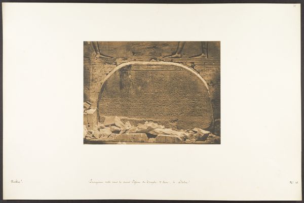 Auguste Salzmann created this photograph, "Jerusalem, Tomb of the Kings of Judah, Fragments of a Sarcophagus," using the waxed paper negative process. The composition is dominated by the stark geometry of the fragmented sarcophagus against the organic, almost chaotic texture of the surrounding foliage. The contrasting textures create a visual tension which may evoke a sense of history disrupted by the passage of time. Salzmann’s choice to focus on these broken remnants speaks to a larger discourse surrounding archaeological exploration and its impact on historical narratives. The photograph functions almost as a semiotic sign; the disrupted form of the sarcophagus challenges fixed meanings. It invites the viewer to question the authority of historical representation and the potential for fragmentation and incompleteness within our understanding of the past. Consider how the formal qualities of the photograph, such as its tonality and composition, serve not just an aesthetic purpose but also engage with broader philosophical questions about history, truth, and representation.