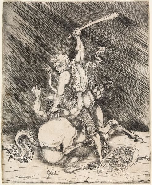 Curator: This is an untitled etching by Georg Baselitz, created in 1965. It's held here at the Tate. What strikes you initially? Editor: Chaos, almost. A whirlwind of lines that seem to coalesce into figures, but remain stubbornly abstract. There's a tension between representation and dissolution. Curator: Baselitz often explores fragmentation, the psychological weight of fractured forms. Notice the prominent hands, perhaps a symbol of creation or control, amidst the disarray. Consider also that this was produced in a Germany grappling with its recent past. Editor: Interesting. So the visual turmoil might reflect a societal unease, a breaking down of conventional narratives after the war. The figure seems burdened, overwhelmed by its own context. It makes you wonder about the role of art in such a landscape. Curator: Precisely. Images carry cultural memory, and Baselitz seems to be dismantling and reassembling those memories through distorted symbols, forcing us to confront uncomfortable truths. Editor: It's a powerful piece, then, not just for its aesthetic qualities but for its historical implications. Curator: Yes, a potent reminder of art's engagement with history.