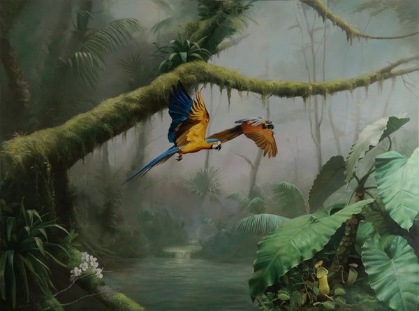 Konstantin Korobov, born in 1985, created “Relictum,” an immersive landscape with elements of surrealism. This beguiling painting invites us into a dense forest where moss-covered trees intertwine with colossal, weathered fragments of what appear to be human features. An eye, an ear, hands emerging from the forest floor, create a disorienting yet strangely intimate experience. Korobov's work evokes a sense of deep time, where nature reclaims the remnants of civilization. It speaks to the transient nature of human existence, set against the enduring presence of the natural world. The single red bird perched atop a finger suggests hope and resilience amidst decay. With this tableau, Korobov prompts us to contemplate our place within the vastness of time and the delicate balance between humanity and nature.