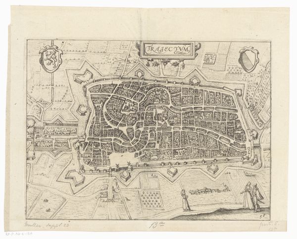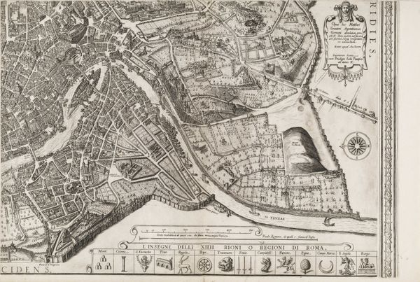 Curator: This intricate etching offers us a fascinating glimpse into 17th-century Rome. Created by Antonio Tempesta in 1645, this print, titled "Plan of the City of Rome. Part 10 with the Tiber and the Villa Farnesina," provides an incredibly detailed bird's-eye view of the city, focusing on the Tiber River and surrounding structures. Editor: My first impression is one of meticulously rendered order. There is a prevailing mood of calm authority – every line, every building feels precisely placed within this overall design. I am captivated by the almost mathematical nature of the representation. Curator: The Tiber, with its sinuous curves, clearly divides the composition and acts as a crucial structuring device. Observe the careful arrangement of the buildings and gardens, their forms depicted with clarity and precision using ink and etching. How does the representation of space itself contribute to the viewer’s understanding? Editor: The Villa Farnesina and other landmarks along the Tiber clearly serve as focal points within the urban narrative. Note the gardens, as well: Water, too, had an overridingly positive symbolism, representative of life, vitality, cleansing, birth, baptism, and irrigation in society, reflecting Rome as a sacred city. Curator: Precisely! Moreover, consider the use of line weight and perspective. The etching technique allows for remarkable detail, creating a textural richness despite the limited color palette. The architectural structures aren't simply represented; they're constructed anew through the careful application of line and tone. Do you notice how this manipulation lends itself to a deeper consideration? Editor: I appreciate your analysis. For me, Tempesta's work reveals a desire to codify and celebrate Roman civic life and achievements of the age. We see pride, knowledge and confidence, even grandeur. Curator: It is tempting to regard the map only through the lens of spatial representation, but formal attributes must also be considered as contributing meaningfully. Editor: It is truly stunning to consider how the symbols, when combined in a structured composition, serve to define, legitimize, and propagate that which Rome and Roman culture represented at this period in history. Curator: A stimulating thought that gives much cause to reassess our positionality, reminding us that aesthetic elements contribute crucially to deeper contextualisation.