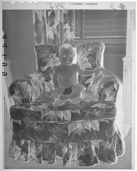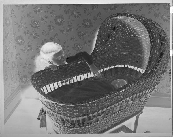 Editor: This is an untitled photograph by Lucian and Mary Brown, featuring a girl peering into a bassinet. The stark tonality creates such an interesting visual tension. What strikes you most about its composition? Curator: Observe how the formal elements—the contrasting tones, the intricate floral wallpaper, and the woven texture of the bassinet—converge to create a complex visual field. The negative space surrounding the figures is as crucial as the figures themselves. Editor: So the interplay of these elements is key? Curator: Precisely. The photograph's impact resides in the relationships between its formal components, inviting us to consider the visual structure as the primary source of meaning. A powerful example of early photographic formalism, would you agree? Editor: I do. I hadn't considered the pure structure before, it really changes how I see it.