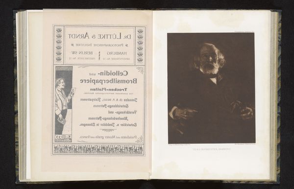 Curator: This is a photographic print of David Octavius Hill, housed here at the Rijksmuseum. Its creation dates to before 1900. What strikes you first about it? Editor: A somber stillness. The sepia tones lend it an aged, almost ethereal quality. The man in front appears wizened, deeply thoughtful, while the man behind him almost looks as if he were waiting in the wings of a play or a social gathering, keen and anticipatory. Curator: It’s a powerful image. Hill, of course, was a pivotal figure in the early development of photography. Understanding how photography emerged in relation to art institutions gives a new depth to viewing it. Editor: The positioning, particularly of the hand in front of him on the walking stick handle, almost forms a visual poem, doesn't it? It is as if we are meant to note his posture, the hand on the handle representing the wisdom and insight from the depths that Hill has found. And from this, insight has grown from wisdom as the walking stick does in physical proximity to Hill himself. Curator: Exactly. The deliberate framing is telling. Photography was initially received with suspicion by some art circles as lacking creative merit; portraiture was viewed as more of a social record. Hill made huge efforts in Scotland to legitimize the process as one capable of artful composition. Editor: It feels profoundly symbolic of the cultural transition underway, of moving away from portraiture where you had to spend many hours posed in front of a painting, compared to that of new freedom offered by this photographic technique. Curator: Precisely. In many respects, Hill also actively fostered public engagement with the new possibilities and promoted the art form's political dimensions. This photograph represents this exact point of view to those within political spheres. Editor: When viewed together, all elements of visual art here offer a commentary that lingers. In the posture, positioning and visual symbology of the sepia photographic tones, this print creates an almost dream-like window into early views of photography. Curator: It is striking how it has managed to encapsulate a cultural shift so successfully and yet retain a modern eye even now. Editor: Indeed, it seems history itself, as art, reflecting.
