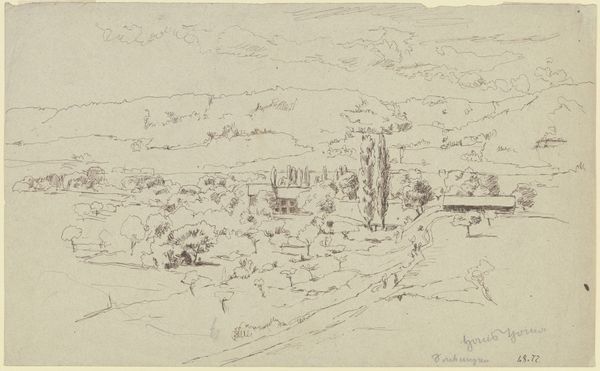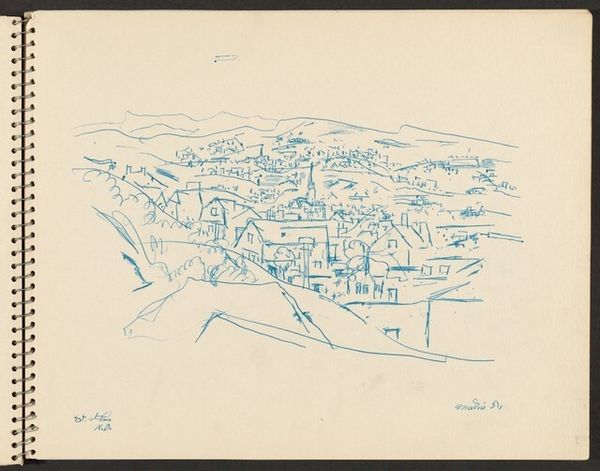 Curator: This is John Marin's 1951 graphite drawing, "St. Johns, New Brunswick, Canada." What's grabbing you right off the bat? Editor: It's so free. You know, almost like a daydream sketched onto paper. The energy of the lines, all loose and kind of scribbly... it feels incredibly alive. Not static, like some cityscapes can. Curator: Marin had a way of capturing movement. He aimed to convey the underlying forces animating a scene, more than photographic detail. Notice how he uses repeated, angular lines to define forms? It's like he's suggesting the push and pull of the elements, the wind, the water... Editor: Absolutely! Look at how he suggests water with those scribbled circles, those ripples… They're not precise, but they communicate the essence so beautifully. And the cityscape itself, so minimal, just enough to suggest a bustling harbour town. Curator: Marin saw the urban environment as something dynamic, in constant flux. He brings that sensibility to his landscapes. You'll find that energy too in his paintings, and particularly in his depictions of the Maine coast. Editor: It's like he's flirting with abstraction but remains grounded in reality. It gives you a sense of place without being overly descriptive. He gives me room to fill in the blanks, which I appreciate. I start picturing myself there, feeling the air. Curator: It's the beauty of suggestion. He provides a framework, and our own experiences color it in. It makes the piece very personal. A simple sketchbook page, filled with a world of possibilities. Editor: A world viewed with a generous, uncritical eye. Thanks to the playful character of the linework, what's presented to us feels joyful rather than bleak. Curator: I completely agree. It embodies an almost whimsical exploration, inviting endless reflection.