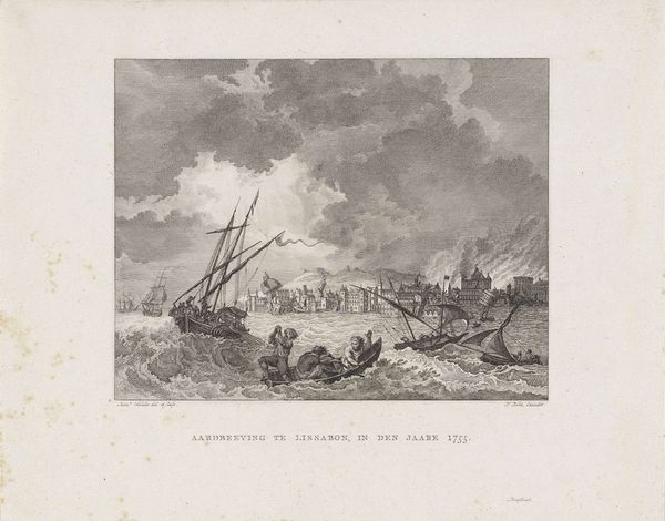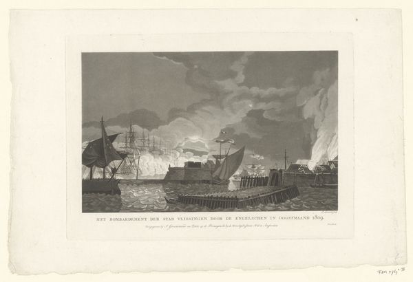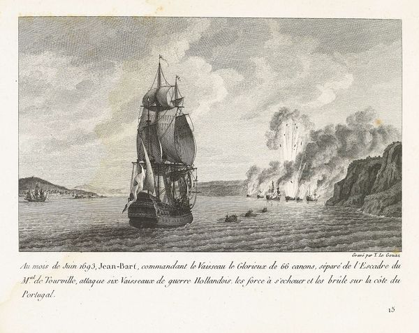 François Jacques Dequevauviller created this print, 'Conquest of a Dutch Warship by French Galleys near Ostend, 1702', in the 18th or 19th century. The monochromatic scene depicts a dynamic naval battle, filled with ships, smoke, and the sea itself. The composition is structured by a contrast between the detailed foreground and the smoky, chaotic background. Notice how Dequevauviller uses line and shading to create depth, drawing the viewer's eye into the heart of the conflict. The vessels, meticulously rendered, appear to be emblems of power and technology, yet they are engulfed in the disarray of war. The materiality of the print, with its fine lines, also invites us to consider the historical context of printmaking as a means of disseminating information and shaping public opinion. It isn't just an aesthetic portrayal of naval prowess; it's also a complex commentary on maritime conflict and national identity. Through its formal elements, the print prompts us to examine the shifting tides of power and perception.