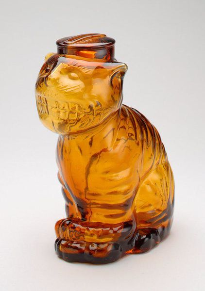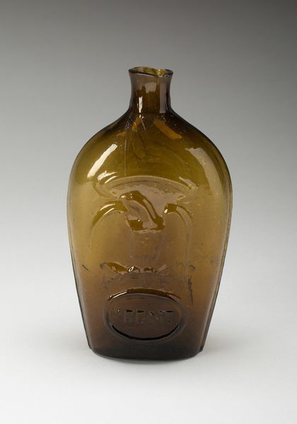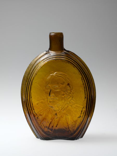 This ceramic bottle, made by Lyman, Fenton & Co., presents a curious composition. The dark, glossy brown glaze drips down the form, creating a play of light and shadow that accentuates the figure of a man seated behind a barrel. The interplay between representation and function is intriguing. The bottle's form is not merely decorative; it merges with the figure it depicts. His rounded belly mirrors the barrel, literally embodying the vessel’s intended purpose. Note how the glossy glaze pools in the recesses of the figure, emphasizing contours and giving a sense of depth. This fusion destabilizes the conventional boundary between art object and utilitarian item, challenging our expectations of what a bottle should be. It invites questions about how everyday objects can embody cultural meanings and artistic intentions beyond their immediate use. The shiny surface further enhances this effect, blurring the lines between the object's form and its surface appearance.