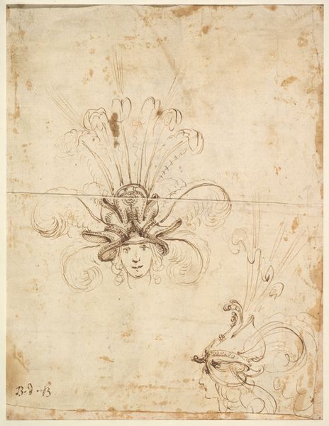 Curator: This is an intriguing pen and ink drawing titled "Female Figure," dating from around 1500 to 1600. The artwork resides here with us, at the Metropolitan Museum of Art. Editor: It feels spontaneous, almost ephemeral, the linework so light. The composition strikes me as quite stylized—the figure feels poised and a little aloof, yet still so centered and symmetric in its placement on the page. Curator: Yes, the figure commands a central position. It's worth noting that in Renaissance art, such idealized representations of women were often associated with virtue and beauty, contributing to larger cultural conversations around female roles and expectations in society. What do you make of that background behind her? Editor: Those decorative elements do appear stage-like, architectural. It feels theatrical and constructed. It brings to mind some stage prop or interior piece—almost as if it might belong on a proscenium. Curator: Precisely! One must consider how such designs played a role in courtly displays or other societal performances of the period, thereby showcasing status and ideals. Editor: Speaking of form, her anatomy looks rather attenuated— elongated arms, stylized draping. Does that inform anything in your analysis of the cultural history? Curator: Absolutely, the deliberate stylization might reflect specific aesthetic ideals fashionable at a certain court. It encourages us to examine patronage; it demands attention be paid to those who commissioned and consumed this visual language of aristocratic culture. Editor: Interesting, the contrast between the raw ink and its delicate details really make you see both at once—it is well framed on this sheet, if not rather ephemeral. Curator: I completely concur. This seemingly simple drawing offers a wealth of insights into the Renaissance artistic landscape. Editor: A truly compelling sketch, and all the richer with that perspective. Curator: Agreed. Examining the drawing provides us a tangible link to that time.
