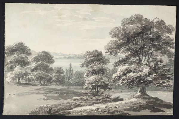 Curator: This landscape, attributed to the British School, presents a tranquil scene executed on paper, measuring about 19 by 25 centimeters. Editor: There's an immediate sense of serenity, a staged calm; the sepia tones lend it a nostalgic quality, like a faded memory. Curator: The composition reveals much about 18th-century artistic practices. The artist's hand is evident in the application of wash, likely a mix of ink and pigment, creating tonal variations that mimic light and shadow. Editor: The figures seem placed intentionally, almost as if props in a theatrical set. I wonder about the social context, the leisure represented here, and the labor that enables it. Curator: Indeed, understanding the materials – the paper, the inks, the artist's tools – anchors us in the physical world of its creation. Editor: It does make you consider the access to leisure, even the consumption of art that might be implied by the scene and how those realities shaped that world. Curator: Precisely, and contemplating the social forces at play enhances our appreciation, I think. Editor: For sure, it prompts me to consider the interplay between the artist, the setting, and those potential patrons. A great way to think about art!