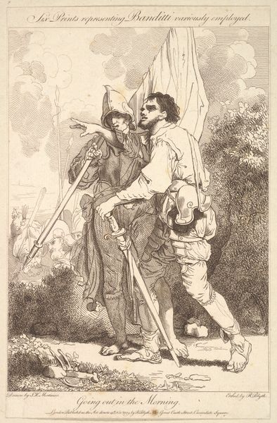 Curator: This etching, titled "Banditti on the Lookout," was created by John Hamilton Mortimer in 1778. It's a wonderful example of narrative-driven figuration, wouldn't you say? Editor: Striking! The rawness of the lines, that almost frenetic energy… the figures emerge from the page, dangerous and immediate. What's the story here? Curator: Well, Mortimer was fascinated by the theme of the "picturesque" outlaw. He often explored these figures, romanticizing their supposed freedom while hinting at the social realities that might lead men to banditry. Remember that this print was made in England. Editor: That context is vital. Are we seeing a comment on social inequity disguised as romance? The materials here—etched lines on paper—become a medium for social commentary, reproduced for a potentially wide audience. It challenges the grand narratives of oil painting by being more easily reproduced and sold. Curator: Precisely. Mortimer produced these prints, likely intended for sale to a growing middle class eager for both entertainment and a hint of the transgressive. The etching process itself, a more democratic form of artmaking compared to painting, speaks to that accessibility. Consider, also, the market that was in play to absorb his prints—their relative affordability, distribution networks. Editor: You can really sense the energy of production. And the performative aspect of "Banditti" interests me. They are "on the lookout," which suggests the public eye even within the bandit's supposed hideout, while there's theatrical staging as they're posed, sword on guard! It looks like a staged tableau, like a performance for us, the viewers. Curator: Indeed! The "Banditti" served a public role. These kinds of images engaged directly with the art market. So what appears at first as merely historical subject matter becomes an entry point into considering 18th-century printmaking and its socio-economic dimensions. Editor: Mortimer has done a great job portraying an idea as well. The choice of materials speaks volumes, reflecting social dynamics beyond just artistic representation. This artwork shows how intertwined artistic expression, materials, and broader social realities truly are. Curator: Yes, seeing it through that lens has opened my eyes to its broader cultural impact. Thank you.