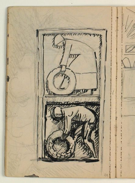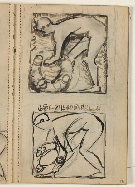 Curator: This intriguing sketch, penned by Niels Larsen Stevns between 1932 and 1935, is actually titled "Udkast til Poul S. Christiansens gravmæle," which translates to "Draft for Poul S. Christiansen's Gravestone." Editor: Wow, for a gravestone design, it feels surprisingly...gymnastic? That figure is really bending over backward. It gives me a slightly uneasy, unsettling feeling, as though it’s a very physically demanding take on mourning. Curator: It's interesting you say that. Gymnastics aside, that positioning, that near-circular pose of the human figure, also evokes the cyclical nature of life, death, and rebirth—an Ouroboros of sorts. The figure nearly encloses a separate circular form below, creating an undeniable echo. Editor: An Ouroboros of sorrow, maybe? I’m picking up the sense that that secondary circular form is almost...hollow? It brings to mind a wreath or, morbidly, the hole in the ground. The limited tonal range throws the symbolism into stark relief, amplifying this feeling. Curator: Indeed. Stevns was clearly working through ideas here; this comes from his personal sketchbook. That use of the figure within a confined square calls to mind memorial tablets or icons where the symbol and shape carry layered meanings over the ages. Editor: There's a beautiful awkwardness, a rawness, in its incompleteness. And it sits so starkly on the page. A reminder that even monumental ideas sometimes start as mere scratches, wrestling with darkness. It’s somehow comforting, in a strange way. It makes the huge finality of death feel a little less scary, a little more like something that is worked through in little pieces of ink on paper. Curator: A fittingly human portrayal for a monument meant to last, rendered temporary and fleeting on the page. I appreciate you highlighting its vulnerable genesis and the symbolism rooted in artistic traditions. Editor: Thanks. Thinking about death and finality makes the ephemeral nature of a simple sketch especially potent, wouldn't you say?