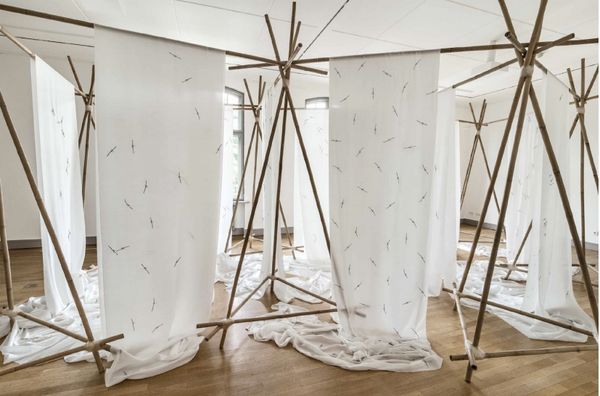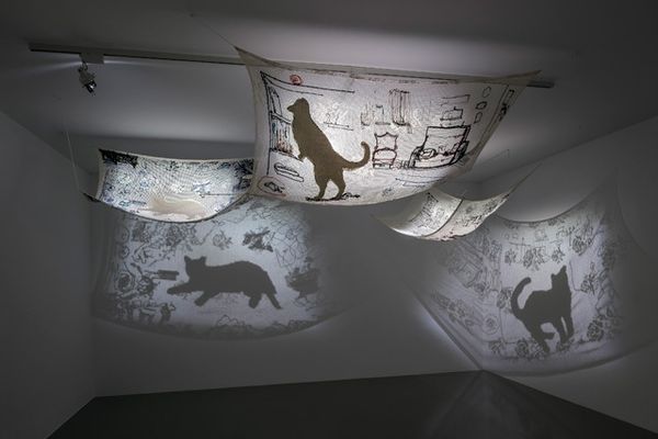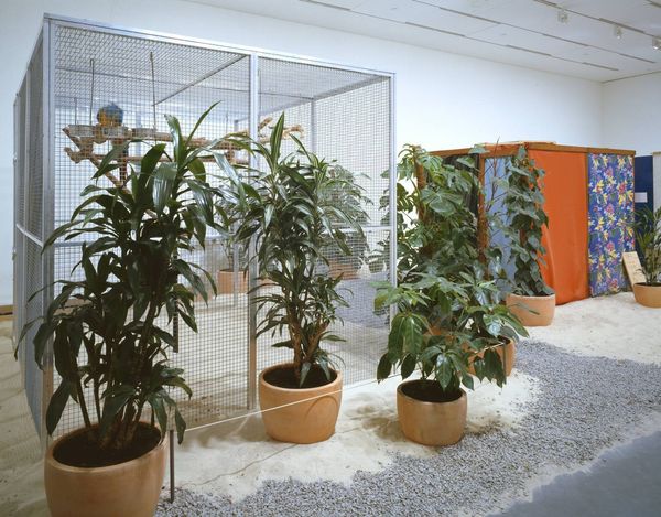 Curator: Here we have "Counterpoint with Flowers," a mixed-media installation created in 1982 by Füsun Onur. It's quite a remarkable example of environmental and site-specific art. Editor: It certainly is… jarring, isn't it? All that cerulean plastic trying so hard to be ethereal. But there’s something almost playfully subversive about the artificiality. It's like a stage set. Curator: Indeed. Onur’s work frequently plays with our perceptions of space and reality. This piece, like many of her others, challenges the traditional boundaries between artwork and environment. How do you interpret her intentions here? Editor: Intention... I see a world, or perhaps a dream of one. Everything is so intensely curated. The almost mournful single tree there, stark against the hyper-real blue… it’s almost Lynchian. A bit David Lynch meets, I don’t know, an underwater theatre production? Curator: An intriguing comparison. Considering the sociopolitical context of Turkey in the 1980s, with periods of political instability and military coups, could Onur have been constructing a commentary on idealized landscapes versus a harsher reality? Editor: Absolutely. The contrast could definitely represent that tension. That vibrant blue backdrop could symbolize the facade of optimism, concealing an unsettling underlying narrative that clashes with that bizarre fabric creature over there, barely able to hold itself up. The rock is what's really interesting. A moment of honesty. A paperweight in this surreal scene. Curator: That is insightful. Onur often incorporates found objects to disrupt the narrative and challenge our assumptions about value. In this context, the rock could represent authenticity. It anchors the piece while exposing artifice around it. Editor: A little rebel. Curator: Precisely. By transforming the gallery space into a carefully constructed tableau, Onur compels us to consider how art and environment shape and reflect society. Editor: For me, the genius of this piece is in its slightly awkward balance. It isn’t perfect; it leaves a sense of unresolved questions and hints at the underlying weirdness of things. Like a memory of a dream. Curator: Very well put. It's a powerful statement on perception, reality, and perhaps a touch of political commentary as well. Editor: Yes, it makes you consider the things you see, or the things you choose to. The stage is set; now, what story will we tell ourselves?