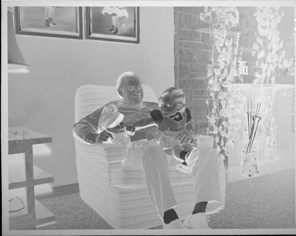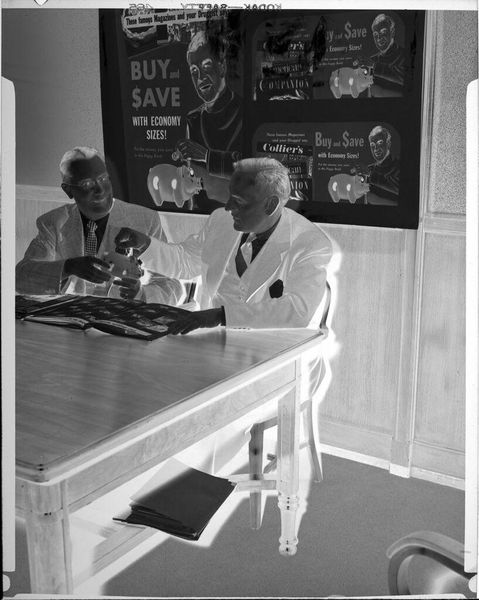 Editor: So, this photograph by Peter James Studio, called "Untitled (two men with piggy bank in front of posters)", shows a scene that's both mundane and a bit unsettling. What draws your eye when you look at this, beyond the slightly creepy piggy banks? Curator: Oh, the piggy banks are definitely the uninvited guests at this party! I'm struck by the layers of advertising, like peering into the mind of a consumer during that era. The men, their suits, even the magazines feel... staged, almost like puppets in a commercial dream. Editor: A commercial dream—I like that! Does the composition say anything about the message? Curator: Absolutely. It's a study in aspiration versus reality. The posters promise savings, but the men are trapped in this manufactured moment, forever trying to sell us something, and perhaps themselves. What do you make of it? Editor: I guess I see how easily we get caught up in the illusion of "buy and save," even back then. It's a bit haunting. Curator: Exactly! Art reflecting life, reflecting ads reflecting desires...it's quite the echo chamber.