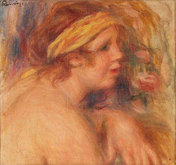 Editor: Here we have Renoir's "Bather, Seated Nude" from 1895, painted with oil paints in that lovely impasto style. It strikes me as both intimate and somewhat dreamlike because the brushstrokes seem to dissolve the figure into the background. What do you see in this piece? Curator: The painting immediately presents a sophisticated interplay of color and form. Consider how Renoir orchestrates the soft, pearlescent tones of the flesh against the vibrant greens and yellows of the landscape. There’s a real formal tension. Editor: Tension? Could you elaborate? Curator: Indeed. Note how the implied lines of her pose—the curve of her back, the angle of her arm—intersect with the verticality of the trees. It creates a dynamic compositional structure, despite the subject's apparent passivity. Are you sensing this? Editor: I am, now that you point it out! The angles weren’t immediately obvious. And the brushstrokes, while seemingly free, contribute to the overall form. Curator: Precisely. Each stroke, each dab of paint, contributes to a system of signs. Renoir’s technique, what might seem purely sensual or impressionistic, reveals a deeper structural order when examined closely. Consider too the contrast in textures – the smoothness he captures in the bather's skin juxtaposed against the roughness of the landscape, creating a sophisticated visual and tactile experience. What do you make of this interplay? Editor: It shows how deliberate his approach was. I used to think Impressionism was all about fleeting moments, but now I see the underlying structure! Curator: Precisely. By analyzing these intrinsic visual relationships, we move beyond subjective interpretation and appreciate Renoir's mastery of formal composition.