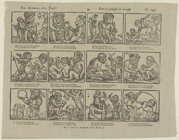Curator: These narrative prints by Schalekamp & Van de Grampel, dating from 1822 to 1849, are quite compelling, wouldn’t you agree? The material—engraving on paper—creates a stark visual experience. Editor: Indeed. The six vignettes illustrating the lives of soldiers feel so active, almost frantic in their execution. With your Formalist perspective, what elements stand out to you upon inspection? Curator: Notice how each panel, enclosed by a definite border, emphasizes line and shape, creating structured forms, yet the individual narratives remain segmented through framing. The deliberate mark-making of the engraving defines not only forms of soliders and horses but establishes complex patterns within the 'genre paintings', suggesting movement and conflict through these abstract formal means. It’s about seeing how those lines are deployed. Where do you feel those lines lead the eye? Editor: My eye keeps moving between the chaotic action within the squares and the somewhat rigid border that tries to contain it. The contrast in shapes and negative space almost amplifies the sense of frenetic action within. It almost becomes cyclical... what does that imply, if anything? Curator: Does the cyclical movement inherent in the work create a sense of endless repetition of military encounters. Each border serves to restrain and define, forcing the viewer to interpret how these boundaries function, to interpret this dance. Editor: It almost sounds like it wants us to notice that while it might seem the vignettes tell separate tales, there’s a bigger theme—the idea of battle as unending? Curator: Perhaps. Though what do you feel this format lends the tales of militairen beyond that, and to your experience of it as a modern viewer? Editor: I hadn't thought of it like that. The segmentation created by those borders in print definitely makes me look for the link, beyond simply observing the actions! Thank you for highlighting the relationships.