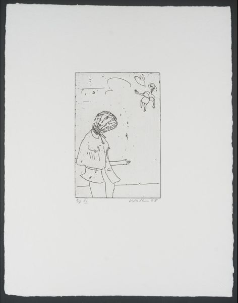Editor: So, this is "The Happy One" by Walter Gramatté. It's a small woodcut print. The figure doesn't strike me as particularly joyous, though, more like lost in thought. What do you make of this piece? Curator: Lost, perhaps, but isn't there a certain lightness in the way he juggles those celestial objects? The sun and that fragmented clock. It whispers to me about the ephemeral nature of time, how happiness might be found in simply keeping things in motion, even if they are broken. Don't you think? Editor: I hadn't considered that. The broken clock makes me think more about anxiety. Curator: But anxiety can be a catalyst, no? Maybe "The Happy One" isn't about constant bliss, but a momentary triumph over the chaos of existence, a dance with worry. Editor: That’s a much more hopeful spin than I initially perceived. Thanks for sharing that!