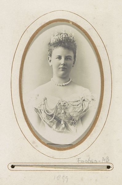 Curator: A remarkably serene image, wouldn’t you say? I feel an immediate sense of calm emanating from the portrait's careful composition. Editor: Indeed. We're looking at "Portrait of Wilhelmina, Queen of the Netherlands," a gelatin silver print taken around 1900 by the photographic firm of Wegner & Mottu. It’s now held here at the Rijksmuseum. Curator: The pearls certainly reinforce that sense of regal tranquility. From a symbolic perspective, pearls often represent purity and wisdom. Combined with the tiara, there's an undeniable suggestion of power tempered by grace. It speaks volumes about the desired image of a young queen at the dawn of a new century. Editor: Formally, it's interesting how the near-monochromatic palette concentrates our gaze. The eye travels smoothly from the subtle gradations of tone in her face, along the lines created by the pearls and down to the subtle floral pattern in the gown. This monochromatic approach heightens our awareness of textures—the smooth pearls, the stiff lace. Curator: Absolutely, the photographer has managed to project an aura of youthful strength. Wilhelmina became queen at just 10 years old, and this portrait captures her youth alongside the gravity of her position. Consider, too, that this image would have circulated widely. Editor: The lack of color could also suggest timelessness. Photography was then quite young, and in the arrangement and pose we see links with older, established art forms like portrait painting. Look at how her face is nearly a perfect oval! Curator: An interesting point. It echoes a classical ideal, making her a symbol that could be readily embraced across national borders and diverse populations. This transcends mere likeness; it approaches archetypal royalty. It feels carefully constructed to evoke enduring concepts of leadership, while presenting Wilhelmina herself as approachable and distinctly human. Editor: Well, the controlled tones certainly give us the 'enduring' feel of much earlier art. In the photograph's balanced construction, Wegner & Mottu are clearly aware of older portrait traditions. Curator: After looking at this more closely, I'm convinced the intention was to project unwavering assurance during a time of both rapid change and lingering uncertainty. Editor: Yes, its composition creates a picture of stability that extends even beyond her reign.