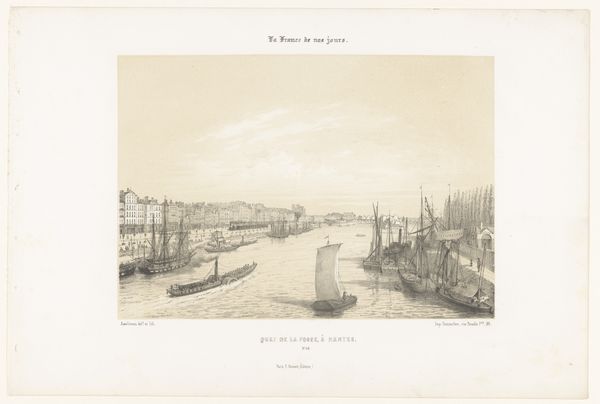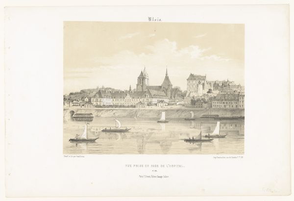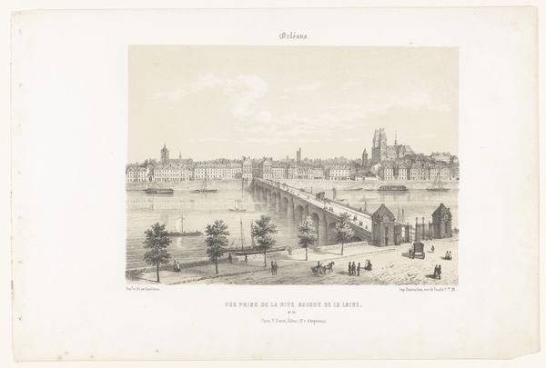 Curator: The subdued tones give this cityscape such a contemplative air. Editor: It’s interesting how tonal range influences interpretation, isn’t it? Here we have Léon Auguste Asselineau's "View of the Pont de la Haute-Chaîne over the Maine in Angers," dating from 1853 to 1856. What do you make of Asselineau’s formal choices here? Curator: Primarily, the meticulous hatching strikes me; the artist utilizes distinct line weights to construct form and guide the viewer's eye, establishing the atmospheric depth. It is also a masterful display of light playing on water. The eye is immediately drawn to the bridge in the foreground—note the careful repetition of vertical supports contrasting with horizontal span—then allowed to roam across the tranquil Maine river, drawing our attention to the urban fabric, carefully rendering various facades. It also appears he is experimenting with linear perspective, yes? Editor: Indeed, the etching process itself is incredibly labor-intensive, isn’t it? It required Asselineau to prepare the metal plate, coat it with a resist, and then meticulously etch the lines through the coating to create the image. He’d need to have controlled application and management of the etching mordant to get this kind of fineness of detail! Considering that time-intensive process makes one consider value of such landscape in pre-photographic days. Also, I’m quite taken with the small-scale human figures dotted along the bridge and river banks, providing an indication of daily life, and perhaps implicitly referring to larger urban context by inviting comparisons of scale to surrounding architecture. Curator: Those human elements also inject vitality and human scale into this vista, softening the harder edges and geometrical rigidness suggested in rendering of the bridge. By including them, he elevates it beyond mere structural study to an appreciation of the city's spirit and the harmonious relationship between its inhabitants and the river. It gives Angers life. Editor: It’s so rewarding to explore how Asselineau so thoughtfully constructed and reproduced what at first seems like just another landscape etching. Curator: Yes, it underscores the inherent beauty found through artistic interpretation and masterful deployment of compositional tactics.