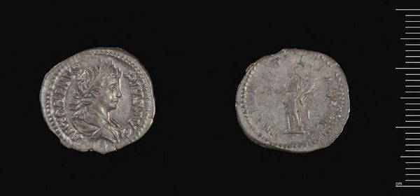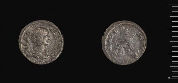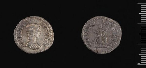 Editor: Here we have a Denarius of Septimius Severus struck for Julia Domna. It's a small coin, obviously, but I'm struck by how much character they managed to fit onto such a tiny surface. What do you see when you look at this? Curator: Well, I see power, cleverly packaged. This isn't just metal; it's propaganda, a mini-manifesto! Look at Julia Domna's profile, then that goddess on the reverse. It’s like they’re saying, "We’re not just rulers, we’re divinely appointed rulers!" Pretty crafty, right? I wonder, did she have any say in how she was portrayed? Editor: Crafty indeed! It really makes you think about the image that they wanted to project and how carefully crafted that was. Thanks! Curator: My pleasure! It’s amazing what stories these little coins can tell, isn’t it?