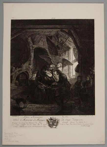 Editor: This is an engraving by Louis Boulanger, illustrating Walter Scott's "La Jolie Fille de Perth." It feels like a snapshot of social dynamics; there's a clear hierarchy in their placement. What do you see in this piece regarding the power dynamics at play? Curator: Notice how Boulanger depicts the characters and their interactions. It invites us to consider gender and class roles within 19th-century European society. Who is being protected, and from whom? What societal expectations are projected onto each figure? Editor: So, the woman, seemingly shielded, and the jester, perhaps a figure of ridicule, highlight those societal constraints? Curator: Precisely. The artwork becomes a lens through which we can critically examine historical biases and power imbalances inherent in the narrative and its representation. How does this knowledge reshape your perception of the scene? Editor: I see it now; it's not just a narrative scene, but a commentary. Curator: Exactly, it prompts us to consider whose stories are told and how.