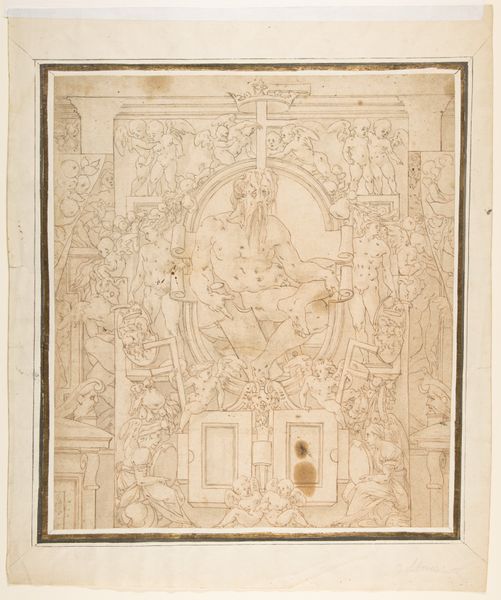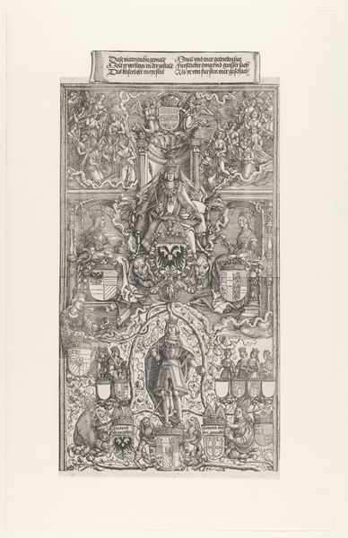 Curator: This print, "Grafzerk van de familie van Adrichem," dating from 1846 to 1881 by Pieter Jacobus Mulder, is a fascinating example of 19th-century engraving. Editor: Yes, it’s incredibly detailed. I find the intricate line work gives it such a formal and somewhat austere feeling. What strikes you most about this piece? Curator: I’m drawn to how this print functions as a historical record and a statement of power. It commemorates a family, the van Adrichems, embedding their identity within a visual language that evokes lineage, status, and perhaps even political influence. Editor: That makes sense. I see the heraldry and the rather severe figures, but how does that connect to a larger conversation? Curator: Well, let’s consider the 19th century context. The rise of industrialization saw a romanticisation of the past. Genealogy and heraldry experienced something of a revival. In this light, how does the “Grafzerk” act as a response to shifting social and political landscapes? What does it mean to inscribe a family's history in such a public and permanent way during that period? Does it speak to anxieties about social mobility? Editor: So it's more than just a gravestone rubbing, it's also a social document? Curator: Precisely! We might even see a tension here – a negotiation between preserving tradition and engaging with the present. Do you notice how certain aesthetic choices lean towards older styles, like a deliberate echoing of medieval art? This could be a form of social resistance, a conscious decision to create an "us" versus "them" in an era of rapid change. Editor: That’s a very interesting way to look at it. I was so focused on the detail that I missed the bigger picture. Thanks! Curator: The power of art lies in how it reflects and shapes society’s dialogue, so always remember to read through a political lens!