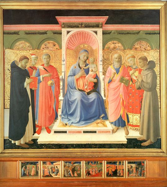 Piero della Francesca's "Polyptych of St. Anthony," now housed in the National Gallery of Umbria, presents a compelling formal arrangement across its painted panels. The composition is strikingly geometric, a signature of Piero's approach. Observe the architectural framework, which divides the sacred figures into distinct yet interconnected spaces. Each compartment, with its precise lines and balanced forms, contributes to the overall harmony. Piero's use of color is equally deliberate; muted tones lend a sense of gravity, while brighter hues draw attention to key figures. Note how the artist employs linear perspective to create an illusion of depth, inviting the viewer into a constructed reality. This technique not only enhances the visual appeal but also serves to organize the narrative elements in a clear, logical manner. Piero’s polyptych exemplifies the fusion of art and mathematics, reflecting the Renaissance pursuit of ideal form and rational order.
