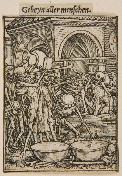 Curator: This woodcut, titled "The Duke" by Hans Holbein the Younger, certainly has a stark, unsettling feel. Editor: Indeed. I'm immediately struck by how Holbein uses the very direct, almost crude, lines to create a sense of urgency and decay. You see Death leading the Duke away, right? Curator: Yes, it's a powerful memento mori. Consider the context: these prints were widely circulated, easily accessible, and served as potent reminders of mortality across social strata. Editor: The texture of the lines gives Death a really horrible presence, and the Duke's finery seems so pointless against it. And look at the hourglass tower in the back—such a loaded symbol of time running out. Curator: Holbein's mastery lies in his ability to make complex social commentaries accessible through craft. It’s not just about death; it’s about the vanity of worldly power in the face of it. Editor: Absolutely. Seeing it this way makes the piece much more resonant for me. Curator: For me too. It is a complex piece.