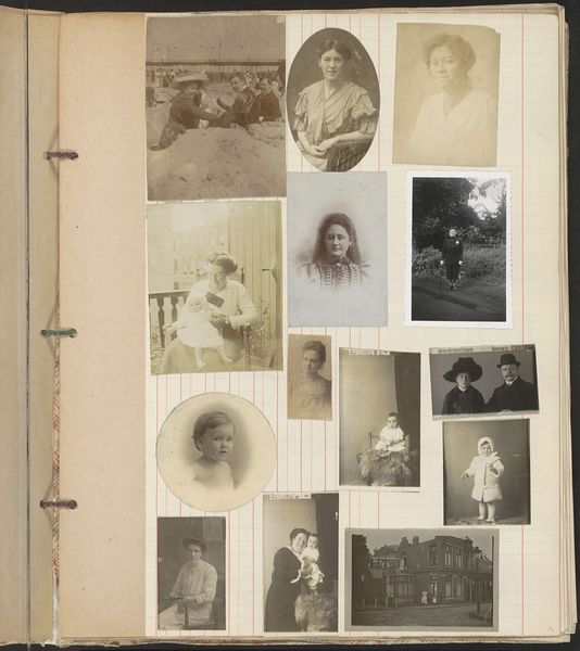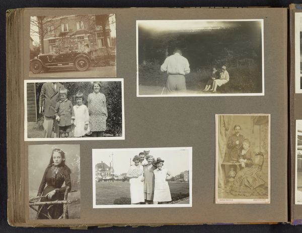 Editor: This mixed-media work, “Gezelschappen en portretten,” or “Companies and Portraits,” created between 1914 and 1925, presents what looks like an album page containing a variety of portrait photographs. There’s a somewhat melancholic tone evoked by the monochrome images, compounded by their candid style. How do you interpret the assembly of these photographic portraits in terms of social history? Curator: It's fascinating how the simple act of compiling a photo album becomes a powerful act of constructing memory and identity. In what ways might these photographs act as visual records of social and familial relationships, reflecting the values and ideals of the time? I would suggest focusing on elements, such as the subjects' clothing or posing; do they tell us something about the individuals portrayed? Editor: That's a keen observation. Thinking about their clothes, the first photo shows a large group, possibly on holiday in 1914 as indicated by a note. What does their casual wear reveal, especially contrasted against the more formal portraits? Curator: Exactly. The formal portraits could signal the sitters' adherence to social conventions and respectability. Considering this was during and shortly after World War I, might these collected portraits function as a way to hold onto those bonds during turbulent times? Editor: It’s so interesting how each photo can carry a message or sentiment that would contribute to a collective memory in this book! Now I wonder who created this personal history… I’d like to dive deeper into portraiture albums of the early 20th century.