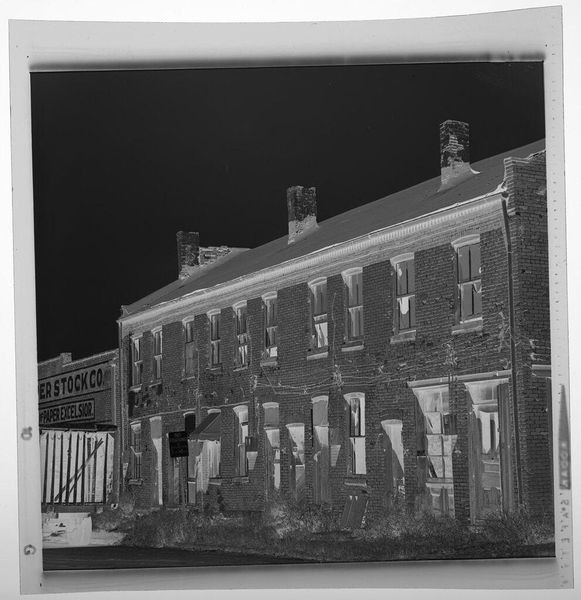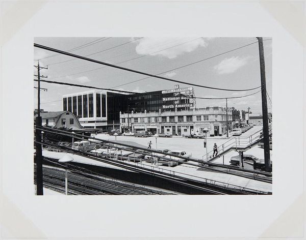 Editor: This is Walker Evans’s photograph, "Houses and Billboards in Atlanta". I find it quite stark, with a fascinating interplay between architecture and advertising. What visual elements stand out to you? Curator: Observe how Evans structures the photograph. The geometric forms of the houses are juxtaposed against the planes of the billboards. Note the tonal gradations, the distribution of light and shadow. Do you see how this creates a tension between surface and depth? Editor: Yes, the billboards almost flatten the image, while the houses attempt to recede. What does this tension accomplish? Curator: Evans highlights the dichotomy between the artificiality of commercial imagery and the solidity of lived space. It’s a study in form, shadow, and line. Editor: I see it now! It's not just a document; it’s a complex visual argument. Thanks! Curator: Precisely. It is in the relationships between these elements that meaning is constructed.