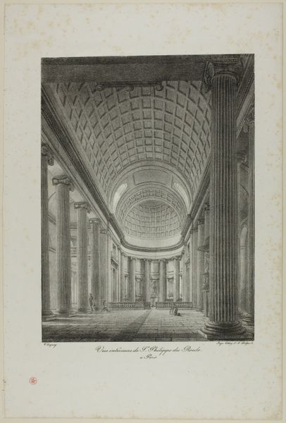 Editor: This print, "S. Philippe du Rouk, Paris," by Jean François Janinet, gives such a formal impression of the church’s interior. It’s a captivating genre scene despite being a study of architecture, mixing religious solemnity with everyday life in 18th-century France. What strikes you most when you look at this work? Curator: What grips me immediately is the calculated use of architectural form mirroring spiritual form. Notice the columns, symbols of strength, running upwards as if supporting not only the building, but also the community’s beliefs. The ellipse, a classical and Baroque structure, almost contains the sacred activities, much like faith shapes community identity. Editor: I hadn’t thought about the shape like that, but the ellipse feels so deliberate. Does the architecture amplify the faith or maybe constrain it? Curator: Precisely! It brings us to consider the intent. Is the rigid structure a supportive framework, or does it limit expression within the sacred space? Observe the light; the luminosity suggests divine presence, but where does it fall, and what does it reveal? It gently illuminates certain figures and obscures others, a reflection of societal visibility during the Baroque era, highlighting power, while hiding disparity. What might Janinet subtly hint through this contrast? Editor: So, the symbolism in something as simple as lighting could comment on social structure? I figured it was simply about Baroque techniques in the etching. Curator: Baroque loves to cloak messages, and Janinet utilizes the architecture not only as a setting, but as a signifier itself, constantly posing queries. It suggests power structures encoded into design that affect personal lives even during devotion. Do you agree the scale and staging lend themselves to such grand narratives? Editor: I do see it now. I will certainly look closer for these cues when observing other art! Curator: Symbols reveal our shared cultural memories, continuously reshaped. Janinet, in his elegant style, teaches us to always observe the depth residing beneath surface.