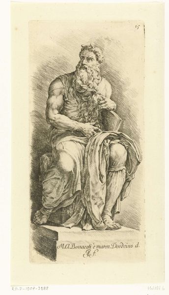 Curator: This image strikes me as one of profound contemplation; the stark lines lend a somber quality to the subject’s powerful physique. Editor: Indeed. This engraving by Jacob Matham, dating to sometime between 1530 and 1580, is titled "Speculum Romanae Magnificentiae: Moses after the sculpture by Michelangelo." It resides today at the Metropolitan Museum of Art. It offers us an intriguing perspective on a work that held significant sway during the Renaissance. Curator: It’s interesting how Matham chose to portray Moses, emphasizing his muscularity. How does that impact the viewing public of the era? Does it reflect an emerging understanding of leadership and power, rooted in not just religious authority, but embodied strength? Editor: Certainly, the image operates within the complex cultural landscape of the 16th century. Matham’s print participates in the visual rhetoric surrounding not just religious but also civic leadership, with imagery used strategically. It also reflects how Michelangelo’s sculpture impacted Rome’s artistic circles; the reproduction disseminated the Italian master's vision beyond those with the means to travel and see the original work. The ‘Speculum’ series as a whole was about documenting and propagating Roman magnificence. Curator: It speaks to broader questions of how art, even in reproduction, serves ideological purposes, and constructs social hierarchies. How are those structures of meaning and influence still apparent in this piece today, centuries later? Considering who gets represented, and how? Editor: Well, thinking about the print's circulation brings the discussion around the concept of art's democratizing potential – as engravings allowed greater accessibility, fostering broader engagement with artistic innovation, and potentially leveling power dynamics that historically restricted access to certain spheres of representation. However, the choice of *what* gets reproduced, the choices in *how* something is reproduced also highlights art's involvement in maintaining cultural hierarchies. Curator: It invites reflection, then, on how historical artwork is instrumentalized within power structures and identity formations. Editor: Ultimately, analyzing pieces like this teaches us how political and cultural dialogues reverberate across history.