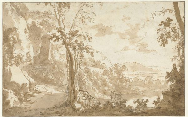 Jan Both made this landscape drawing with pen and brown ink, brush, and gray wash. The apparent ease of this seemingly simple drawing belies the skill required to produce it. Using the pen and brush to create different tones through hatching, and the layering of light and dark wash, the artist expertly recreates the effects of natural light on the depicted Italian landscape. The figures on the road, with their pack animals, suggest a common scene of working life. Both elevates the depiction of labor to a higher art, making it the central point of the composition. Both’s mastery of the drawn and washed medium reminds us to challenge the hierarchy of techniques, understanding that artistic brilliance resides not only in the grand gesture of painting but also in the delicate handwork seen in this unassuming drawing.