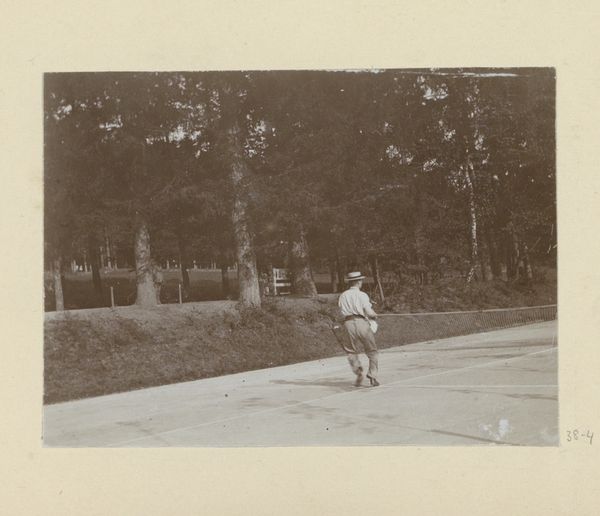 Editor: This photograph, "Nine Power Conf. - Golfing" by Erich Salomon, shows a man golfing in a field, with a woman standing nearby. The stark contrasts between light and shadow create a rather melancholic mood. What compositional elements stand out to you? Curator: The photograph's formal structure is immediately apparent. Note the linear arrangement of trees in the background, contrasting with the golfer's dynamic pose. This juxtaposition creates a visual tension, a dynamic play between stillness and action. How does this contrast affect your reading? Editor: I think it adds a sense of unease, almost like the golfer is trapped in a landscape that's both beautiful and slightly ominous. Curator: Precisely. The composition invites us to consider the relationship between the figure and ground, between individual agency and the larger forces that shape our experience. A seemingly simple photograph reveals complex relationships through its formal arrangement. Editor: That's a really interesting way to look at it, thank you.