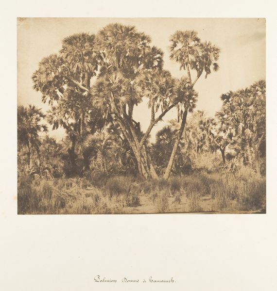 Editor: Here we have Maxime Du Camp's "Bois de Dattiers et de Doums, à Hamarneh," a gelatin-silver print from around 1849 to 1850. It's a fascinating early photograph. It really evokes the density and texture of the foliage; it’s a kind of structured chaos. What strikes you when you look at this photograph? Curator: Immediately, I’m drawn to the tonal range and how it articulates depth. Observe how the photographer utilizes subtle variations in light and shadow to delineate space. What principles do you think the photographer employed to frame this scene and create such a detailed rendering of form and texture? Editor: I guess, Du Camp carefully chose his vantage point to capture the layered effect of the trees, their canopies creating distinct planes. How do the specific material qualities of a gelatin-silver print contribute to its overall effect here, beyond the composition? Curator: Exactly! The gelatin-silver process, celebrated for its capacity to yield an exceptional range of tones and precise detail, allows the artist to define shapes. It's as if he’s dissecting the light itself to mold the scene. How do you think the image relates to landscape and orientalist artistic traditions of the period? Editor: Well, landscape seems inherent to the subject. Maybe its aesthetic relates more broadly to idealized or romanticized views of the “Orient”? But your insights have helped me recognize the artistry residing in the details of process and tone. Curator: And you've articulated the context of the photographic subject itself in cultural practices, noting that those themes emerge from careful engagement with forms. The beauty is inseparable from its material construction.