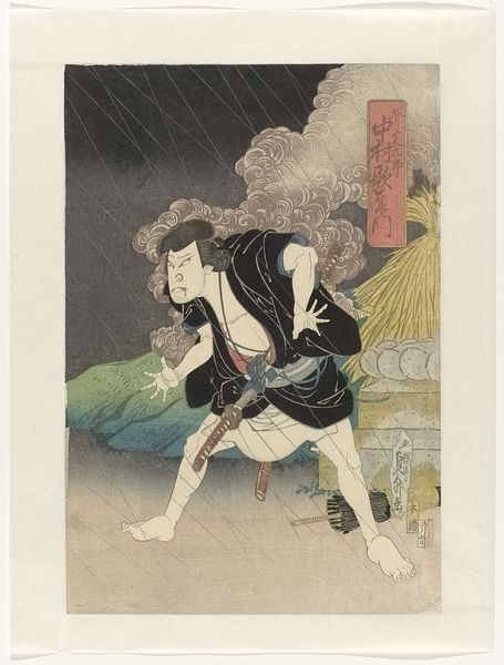 Curator: Here we have Suzuki Harunobu’s "Woman Running to Escape a Sudden Shower," a woodblock print in the collection of the Harvard Art Museums. It’s a chūban size, so fairly intimate in scale. Editor: It looks like a fleeting moment. The diagonal rain and her frantic gesture create a feeling of immediacy, like she’s been caught off guard. I wonder, do you feel an invitation to participate in her escape? Curator: The umbrella becomes a shield, doesn’t it? The image is charged with symbols of transition, from a peaceful stroll to a frantic run, from dry to soaked. It speaks to the impermanence of our best-laid plans. Editor: Right! And that umbrella—such a simple form, yet it becomes a stand-in for protection, a little personal haven against the downpour. Maybe we need to think about how often we search for these havens. Curator: It's a lovely meditation on the unexpected, and the grace with which we sometimes handle it. Editor: Exactly. It reminds us that beauty can be found even in the midst of a sudden shower—or whatever that shower represents in our own lives.