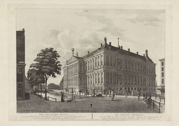 Curator: Here we have an engraving from around 1774-1775, titled "Nieuwe Schouwburg te Amsterdam," which translates to "New Theatre in Amsterdam." It's by Noach van der Meer the Younger and gives us a clear picture of the theatre and its surroundings. Editor: My first thought is that it’s astonishing how bustling everything feels! It’s black and white, yet somehow vivid. You can almost hear the chatter and feel the energy of the place. All those little people… like ants. Curator: Absolutely! It captures the theatre's significance within Amsterdam's social fabric. Look at how it dominates the square – it’s meant to impress. The placement highlights how public spectacles became key civic experiences. Editor: And there's life spilling out everywhere. Children playing, vendors selling goods, a dog trotting along... What do you think the shows were like? Did commoners even get to go, or was this strictly an aristocratic amusement? Curator: Access to theaters in the 18th century was structured, with separate entrances and seating arrangements based on social class and status. The "New Theatre" here catered to a diverse audience. This is visible from documentation outlining ticket prices and regulations, suggesting a broader public presence. It's not just an aesthetic depiction but a social commentary on the city's theatrical culture. Editor: So, it’s not just a picture of a building. It's a slice of life, an advertisement, a social map all at once. Like walking into a diorama. You can create a story about any of the tiny people there. Curator: Precisely! Van der Meer offers not only architectural accuracy but also a record of societal hierarchies playing out in a public venue. This piece provides valuable insight into the intersection of social performance and theatrical experience during that time. Editor: Knowing all this, it feels less like just looking, more like a glimpse into someone’s life. Curator: Indeed, considering its historical moment gives it that feeling. It illustrates a specific intersection between culture, social structure and artistic representation in Amsterdam. Editor: Definitely deepens the experience, and the theatre, no longer just a building. More a meeting place of lives.