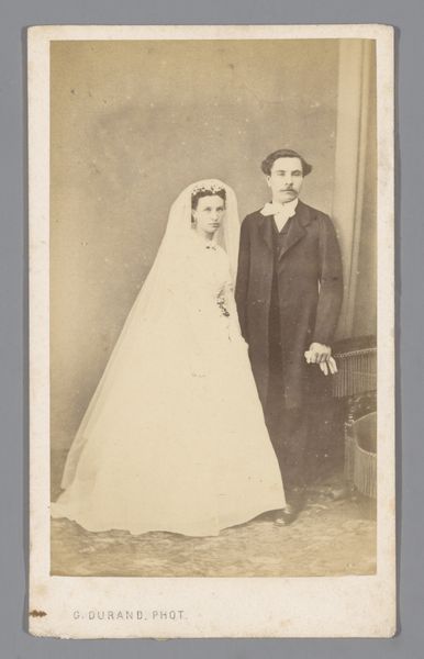 This photograph by Koene & Büttinghausen captures a wedding portrait, preserving a moment laden with cultural symbols. The bride’s white dress and veil symbolize purity and a new beginning, echoing ancient vestal virgins. The groom, in his formal military attire, embodies duty and protection, hinting at the roles each will assume within their union. Note how their joined arms are reminiscent of the ancient Roman tradition of dextrarum iunctio, a gesture sealing agreements and unions, visible throughout antiquity. Consider how the veil, initially a symbol of shielding and mystery, has undergone continuous transformation. Once a representation of modesty, here it serves as a theatrical flourish, framing the bride's face and enhancing her visibility. This shift reflects a broader societal change, moving away from the bride as property and towards her recognition as an individual. Such images, laden with tradition yet mutable in meaning, remind us that cultural memory is not static but continually renegotiated. This photograph is not merely a record but a dynamic interplay of enduring symbols.
