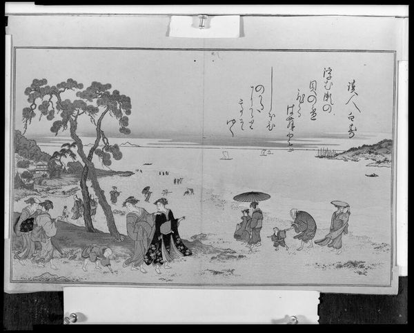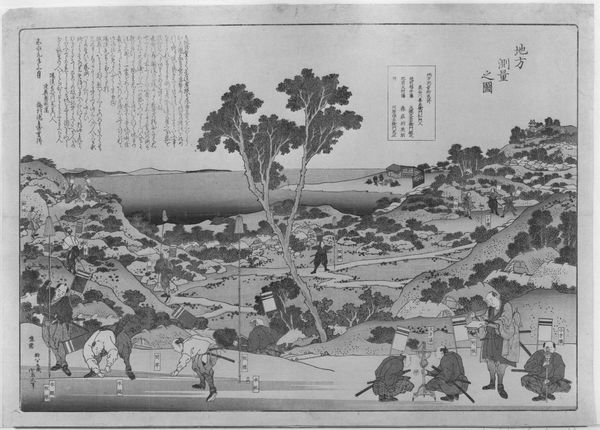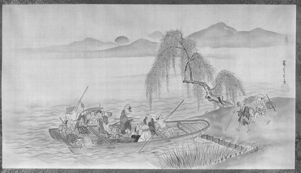 Curator: Utagawa Hiroshige’s woodblock print, "Fujiyeda" Station No. 23, offers a glimpse into his series, "The 53 Stations of the Tokaido." The dimensions are roughly 22 by 34 centimeters. Editor: Immediately, I see a sense of weary persistence; figures wading through water, burdened but moving forward. You can almost feel the chill. Curator: This print is more than just a pretty picture; it illustrates the intensive labor behind travel in 19th-century Japan, highlighting the working class experience. Editor: Exactly! The woodblock technique itself involved skilled artisans, each carving and printing separate blocks. Think about the labor that went into each impression! Curator: It's a dance between artist and artisan, a collaboration that speaks to the interconnectedness of society. I see a poignant melancholy in this piece, a reminder of shared human struggle. Editor: True, but this melancholy is also a commodity, packaged for urban consumers eager for a taste of "authentic" travel without the hardship. A tension there, I think. Curator: Perhaps. It's fascinating how an artwork can hold both beauty and complexity, prompting us to reflect on history and our place within it. Editor: Absolutely, and considering its materiality—wood, ink, paper—it connects us to specific networks of trade and labor that shaped both the artwork and the world it depicts.