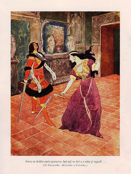 This is an illustration for Fairy Tales For Adults by Artuš Scheiner. Notice the woman's gesture with her arms raised, framing her head. This pose echoes the ancient "orant" figure, seen in early Christian art, a gesture of prayer and supplication, yet here, it's imbued with a sense of vulnerable display. The crown upon her head and the minimal clothing point to themes of exposure and power, of being both sovereign and subject. Consider how this gesture, though rooted in religious entreaty, resurfaces in secular contexts. In theatrical performances and even mundane expressions of surrender, the raised arms persist, yet the meaning shifts. It is as if the collective memory retains the primal, emotive force of this gesture, re-encoded across time. The interplay of the sacred and the profane creates a captivating tension, engaging us on a primal, subconscious level, as these archetypal symbols evoke profound emotional states.