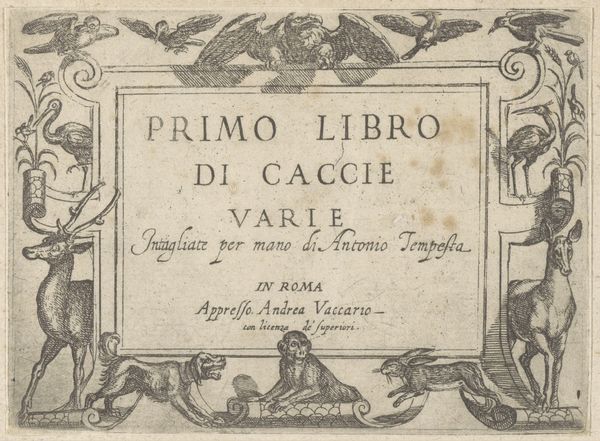 This is the title page for "Second Book of Various Hunts," an engraving made in Rome by Antonio Tempesta in the late 16th or early 17th century. The print, brimming with animals, invites us to consider the cultural status of hunting and its relationship to the natural world. During this time, hunting was both a sport for the aristocracy and a means of survival for the lower classes. Tempesta, moving between Rome and Florence, would have understood these different social positions. The image reflects the entangled relationship between humans and animals, not only in the hunt, but also in the creation of this print. The artist’s hand has captured these animals, transforming them into objects of aesthetic contemplation. Consider how Tempesta blurs the line between the observer and the observed. What do you feel when you look at the animals looking back at you? It's in this exchange that we can reflect on our place within a larger ecosystem.