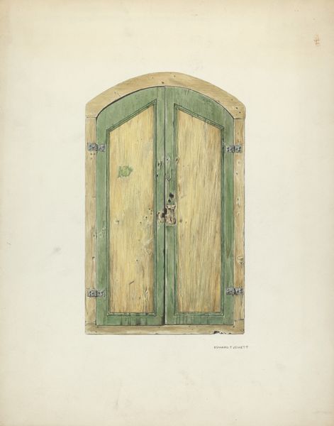 Curator: What a calming blue. There's something deeply still about this image. Editor: Indeed. The artwork we are observing is titled "Grille and Mission-House Window (Interior)" by Geoffrey Holt, rendered circa 1940. It's a watercolor drawing. Curator: Ah, watercolor, it does explain that gentle feeling, doesn’t it? It makes me think of hot summer days, a slight breeze coming through an old window, and escaping reality through this exact glimpse. The simplicity almost makes it holy. Editor: Considering the title, that feeling makes a lot of sense. Mission-style architecture in the United States often reflects the history of colonization and forced assimilation of indigenous people, cloaked in a religious garb. Windows like this one, within mission houses, physically and metaphorically controlled who and what entered, underscoring that power dynamic. Curator: It’s odd, isn’t it? To see such peace and also confinement in one image? Editor: Precisely. Holt captures that architectural detail—the bars acting almost like a minimalist painting inside the frame, as well as its inherent complexities of cultural imposition. Notice how one shutter is slightly ajar? It invites speculation about access, freedom, and perhaps also resistance within confined spaces. Curator: Almost as though light is being smuggled in! It gives a little hope. How clever to focus on this detail of the building. Windows are often the subject, and become symbols of our yearning, but I hadn’t considered them from that angle. Editor: This type of image, painted at this moment, also can remind us of how public and private, interior and exterior were, and are, carefully negotiated within our culture through architecture, art, and history. Curator: So true. This gentle-seeming piece is not as straightforward as I first thought. Thanks for nudging me into seeing past the window, so to speak! Editor: A powerful reminder to reflect on both the aesthetics and the underlying social narratives interwoven within a seemingly simple window.