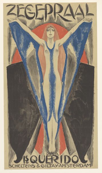 Curator: Abraham P. Hankins' "Red, White & Blue" offers an intriguing example of modern printmaking. It seems the piece involves woodcut techniques. Editor: Immediately, it strikes me as quite bold—a dynamic tension between those clean geometric shapes and the texture implied in the print. Curator: Absolutely. It evokes a sense of, dare I say, abstracted patriotism. The colors are immediately symbolic, tapping into a shared cultural language. Yet, the figure remains fragmented, almost deconstructed. I’m curious about what emotions the artist meant to trigger in the viewers. Editor: It feels inherently political, but not in a direct, representational way. More in how it challenges traditional artistic norms, mirroring a broader shift in societal values and the rise of modernist aesthetics. I see abstraction as political because it removes authority from conventional modes of art making. Curator: I think you’re spot on. If we consider the period when modernism takes full swing, art enters the public arena like never before. Art is no longer confined to the church, court, or private salon, and enters popular spaces, reflecting new ideas about who the viewer is, what matters, how identities can be defined through abstraction as much as by the realistic portrayal. This artwork appears as more conceptual rather than nationalistic. Editor: The composition is fascinating. The interplay between red, white, and blue certainly sparks thoughts about national identity. Could it be commenting on ideals versus the lived experiences, a dichotomy embedded in the symbolism itself? Curator: Precisely! Red, White, and Blue are heavily symbolic in Western iconography. You have, on one hand, associations with liberty and purity but they could also embody themes of power, conflict and the body through the figure we see here. What I admire is how such limited imagery holds such possibilities, sparking unique ideas of meaning. Editor: A fascinating study in the power of abstraction and symbolic colors. Curator: Indeed; a rich, if concise, dialogue on visual language and its ever-shifting interpretations.